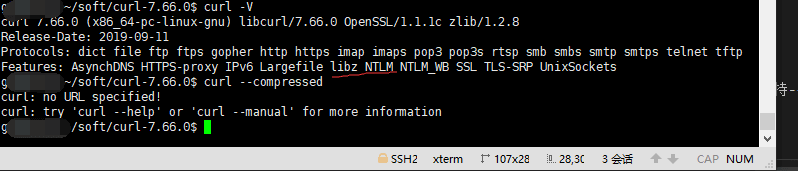 根据两个版本特征的对比,我知道了不能使用–compressed选项的版本是确实了libz,我顺便搜了一下libz是干啥的。libz是一个提供函数压缩的函数库,需要安装zlib安装包。我有通过./configure -h,发现了在安装curl时有个–with-zlib选项,如果指定了这个路径,然后重新编译和安装,最后就可以了,先上一张截图。