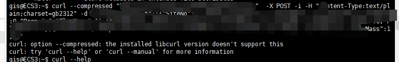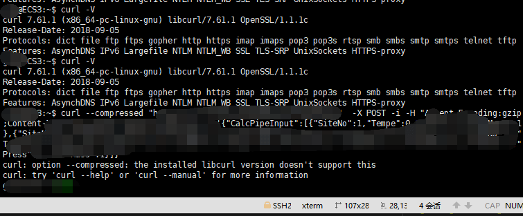 尝试了很多方式,升级curl,还是没有解决。奇了怪了,一个版本是curl 7.29.0 (x86_64-redhat-linux-gnu) libcurl/7.29.0(这个版本可以使用–compressed参数),另一台服务器的版本是:curl 7.61.1 (x86_64-pc-linux-gnu) libcurl/7.61.1 OpenSSL/1.1.1c (这个高版本的反而不支持–compressed)