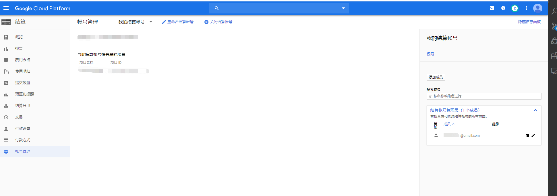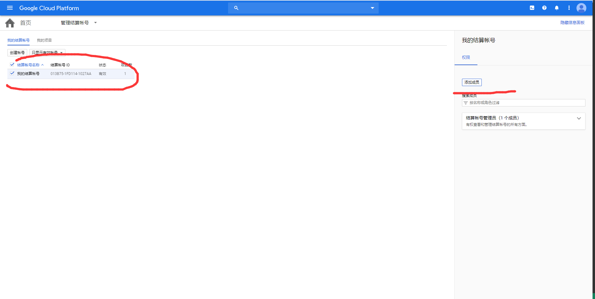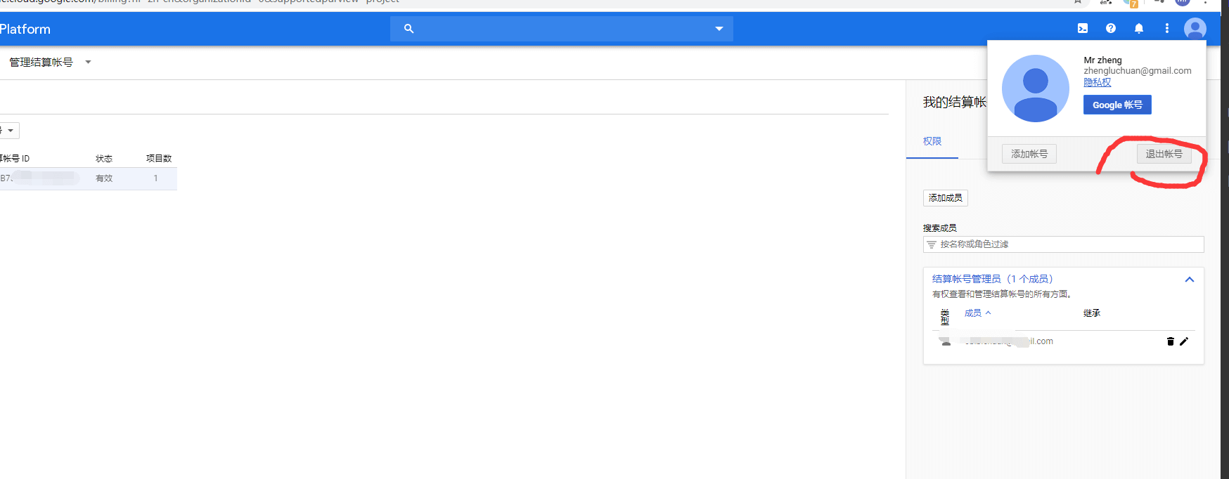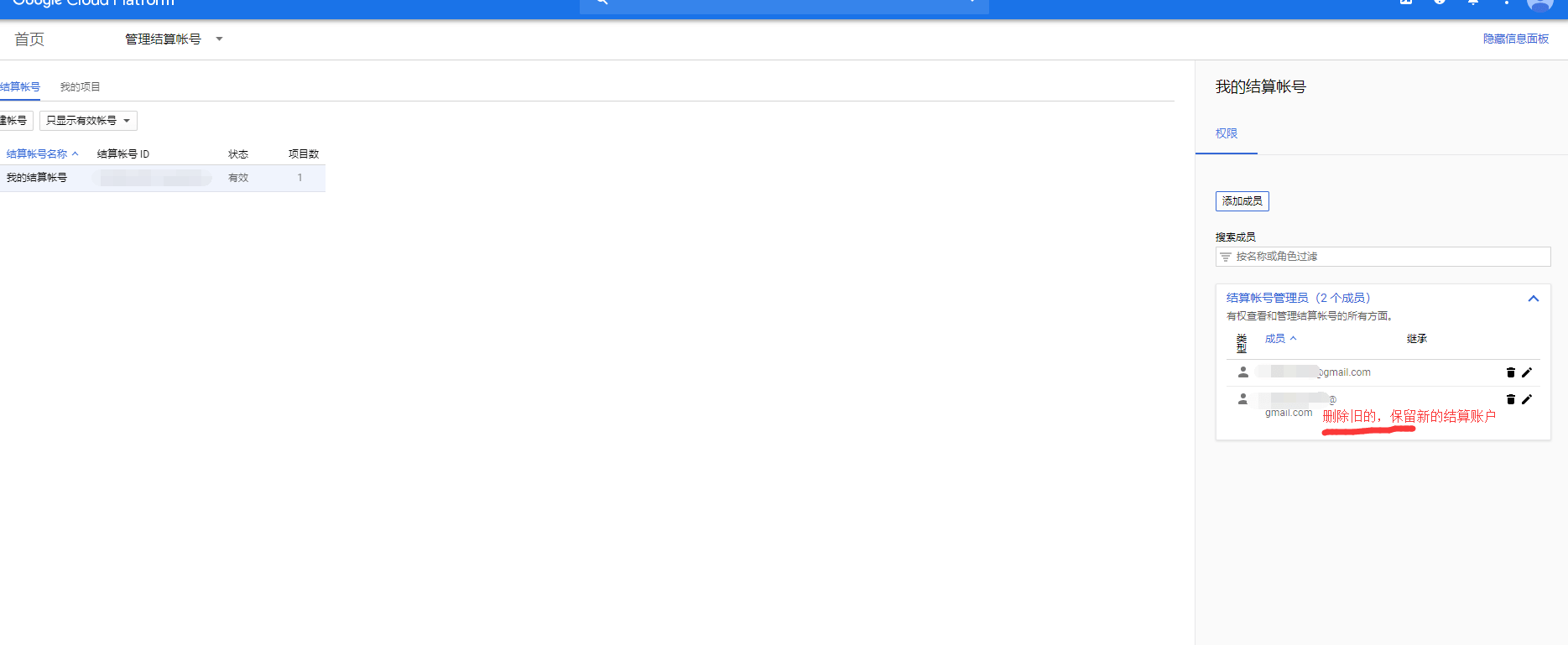 (6) 我再次查看结算账户管理员,发现又只剩下一个成员了,就是新账号(b@gmail.com),而我昨天晚上增加的那个老账号(a@gmail.com)已经不见了。