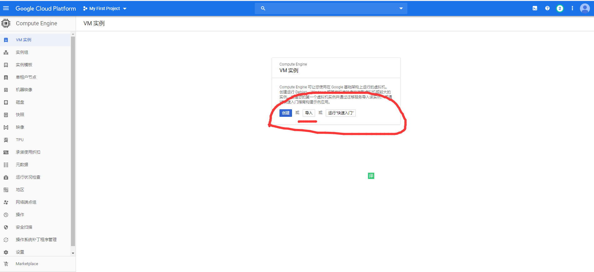 (3) 登入新的账户(b@gmail.com),选择Compute Engine-> VM实例-> 会提示创建或者导入,我们选择导入