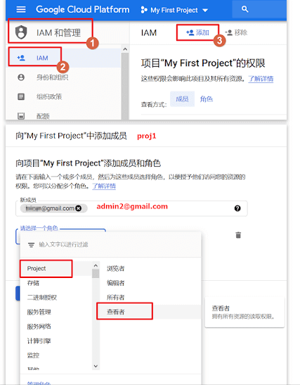 (2) 在老用户(a@gmail.com)IAM中添加新用户(b@gmail.com)的权限,注意这里选择上发送邮件通知。
