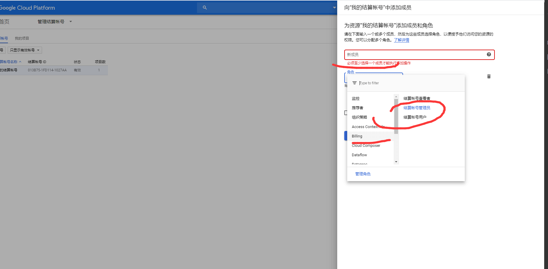 (2) 选择结算账号名称->添加新成员