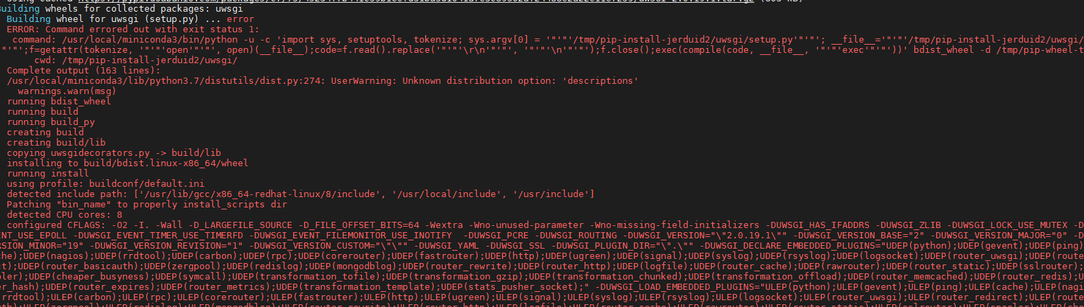 (1) Building wheel for uwsgi (setup.py) … error