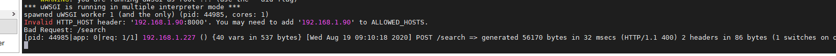 成功启动了uwsgi之后,访问相关的内容,出现了host错误:Invalid HTTP_HOST header: ‘192.168.1.90:8000’. You may need to add ‘192.168.1.90’ to ALLOWED_HOSTS.