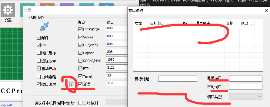CCProxy除了实现常用的代理设置之外,还可以实现端口转发的功能,在设置界面的端口转发后面的E按钮,可以打开端口转发设置界面。设置目标地址,目标端口,以及本地监听端口,可以实现监听本地端口,然后转发到目标端口的功能。