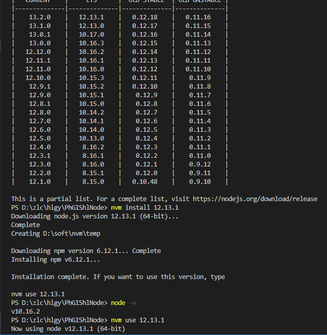 1 2 3 4 5 6 7 nvm list available nvm install 12.13.1 nvm use 12.13.1 node -v