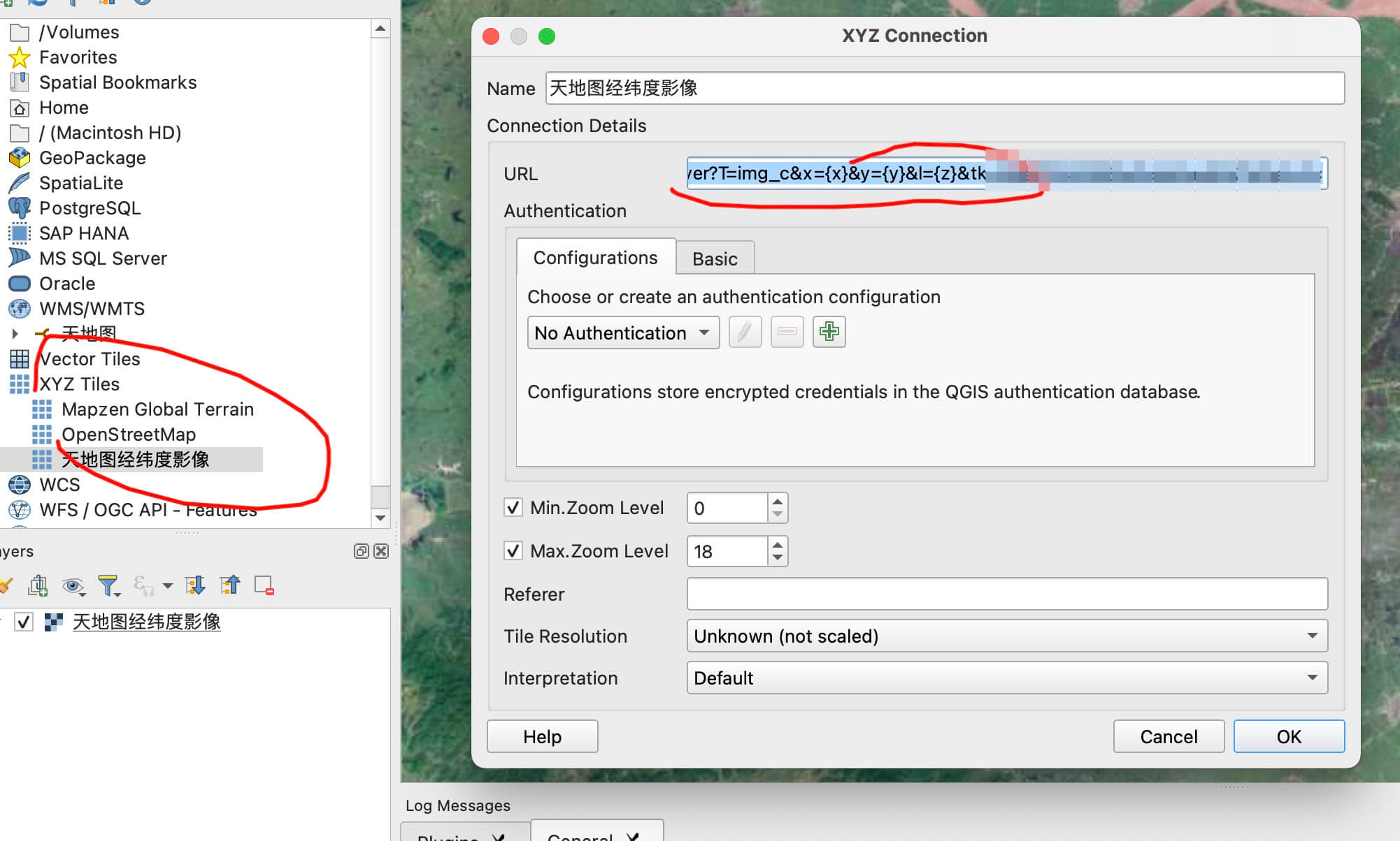 1.QGIS中加载天地图 采用了XYZ的方式加载的影像。