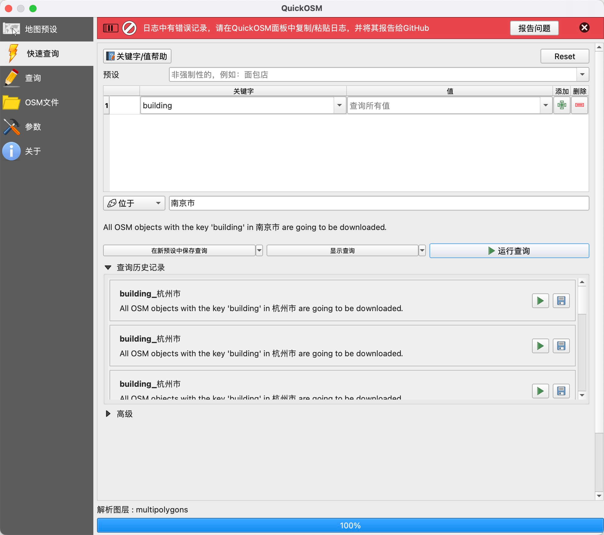 当我在搜索栏中进行杭州市或者是南京市的建筑物的时候,显示错误信息,我尝试搜索贵阳的建筑物信息,结果就是好的。
