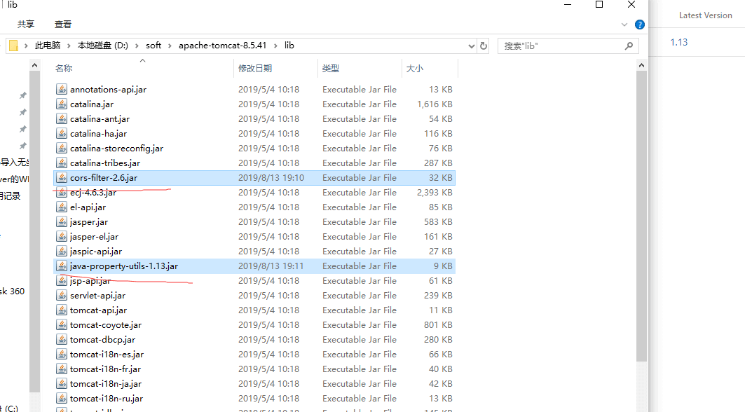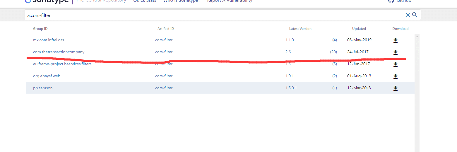 (1)一种方式是像上面一样,用jsonp请求,还有一直方式,就是配置geoserver的跨域请求。配置跨域请求时需要到 https://search.maven.org/search 下载cors-filter.jar,java-property-utils.jar,版本最新的就好了