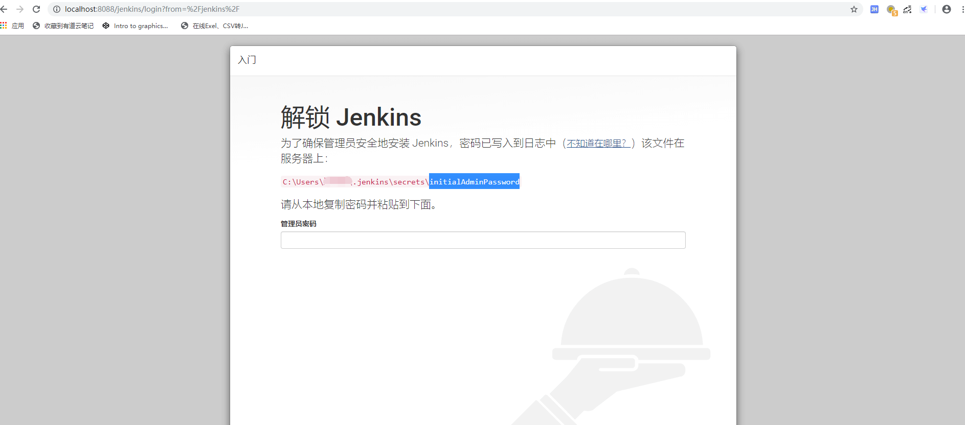 安装成功后,启动网站,或者输入Tomcat地址:localhost:8080/jenkins,打开网站。首次打开需要填入密码。