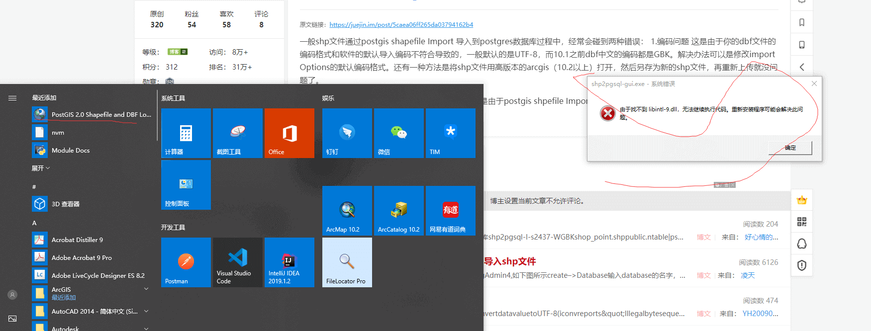 1.解决PostGIS打开shp文件输入输出模块出现”找不到文件libintl-9.dll”的问题