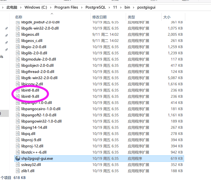 这里只要找到postgis安装目录:C:\Program Files\PostgreSQL\11\bin\postgisgui,然后复制一份libintl-8.dll副本,改名为libintl-9.dll即可。
