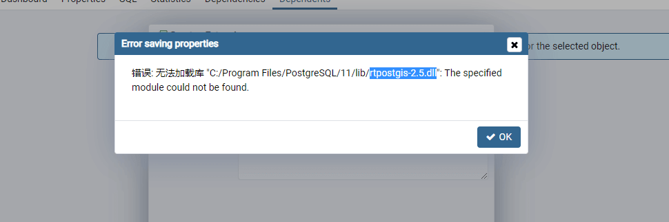 结果报错无法加载rtpostgis.dll,模块未定义,“错误: 无法加载库 “C:/Program Files/PostgreSQL/10/闪电b/rtpostgis-2.5.dll”: The specified module could not be found.”,但是实际上,我查找了,这个文件所在地,C:\Program Files\PostgreSQL\10\lib\rtpostgis-2.5.dll,文件确实存在,问题会出在哪里呢?翻遍了网上,问遍了群友,就是没有遇到这个问题的人。