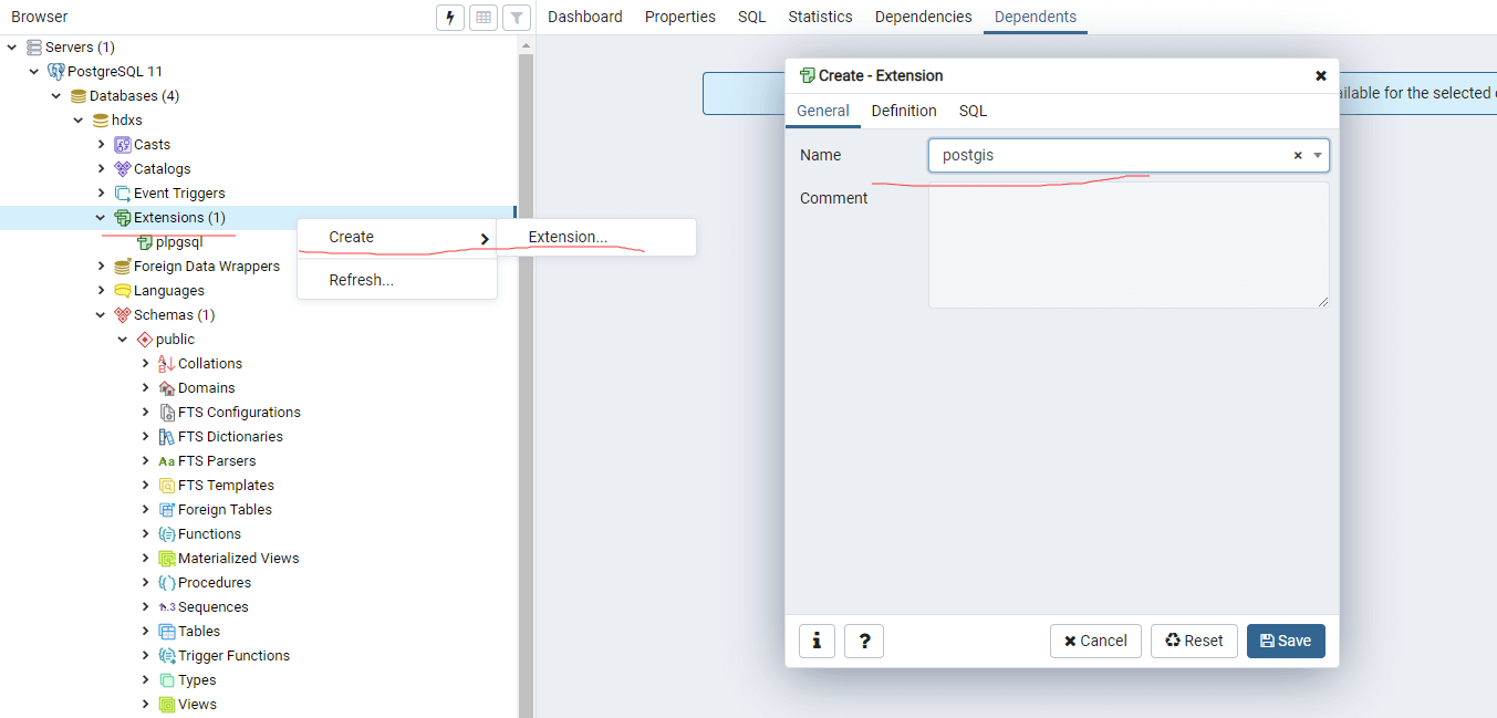 遥想公瑾当年说,是因为没有create extension postgis;我在pgAdmin 4中扩展一栏中创建创建要给扩展: