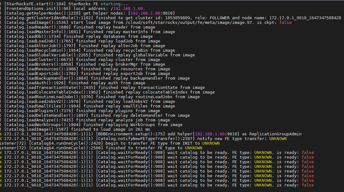 在启动fe节点的时候,总是启动不起来,使用jps查询,倒是出现了 StarRocksFE 这个进程,使用mysql客户端连接,但是连接不上,查看日志 log/fe.log 中,出现的内容如下: